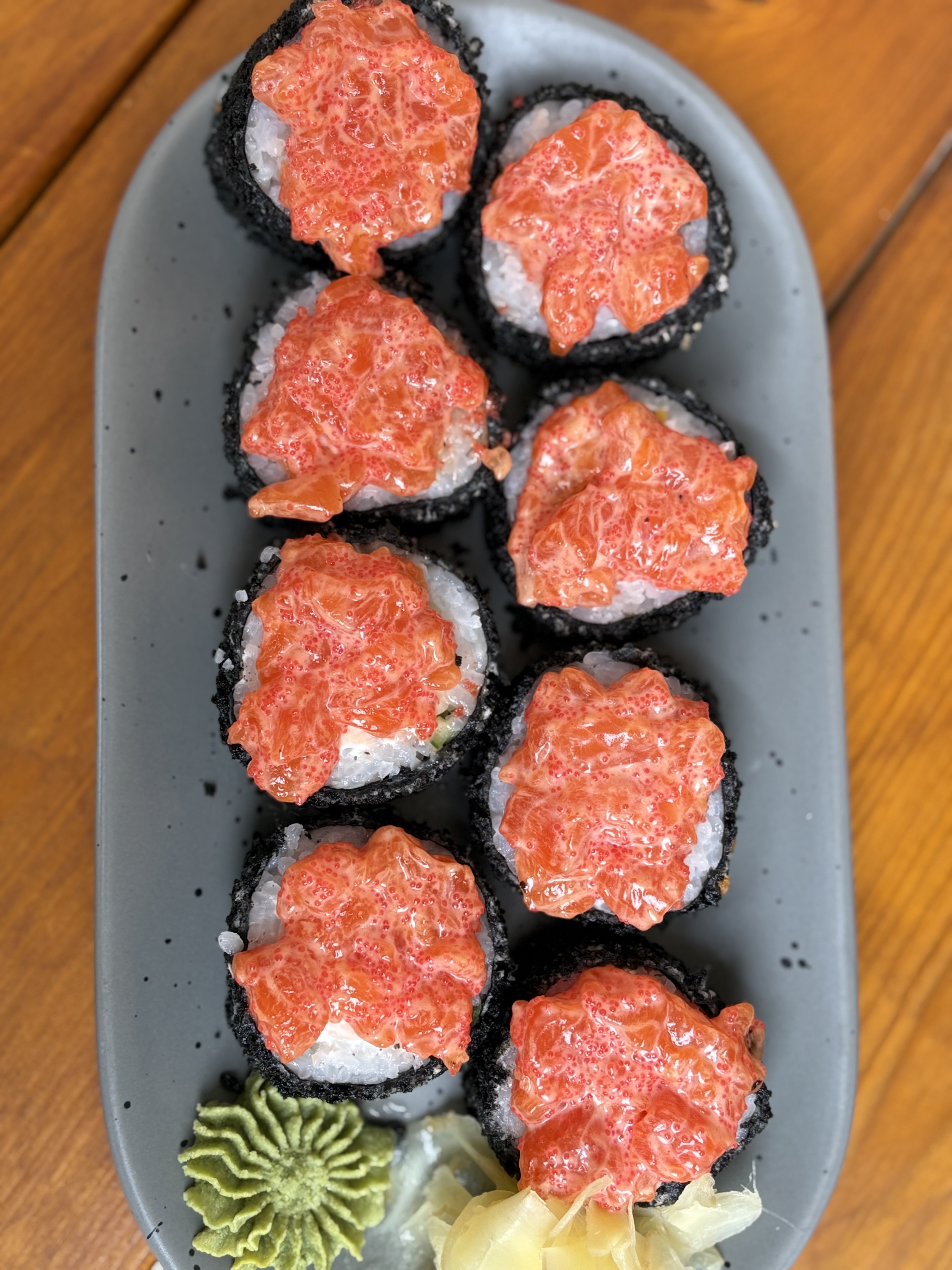 Гункан з лососем та червоною ікрою